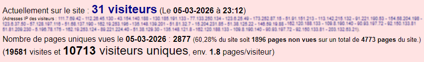 | Commentaire Sur Sarah Knafo | 72) Oui, je crois qu'il a enfin compris. Je viens de regarder les chiffres, 31 visiteurs actuellement en ligne et aujourd'hui on est dans la moyenne avec déjà plus de 10 700 visiteurs uniques depuis 0h00 alors que la journée n'est pas encore terminée. Un jour correct quoi... | De Cyril (Webmaster) Le 05-03-2026 à 23:11 {G.C.A.G.T.B.G.S.G.G.C.C} |