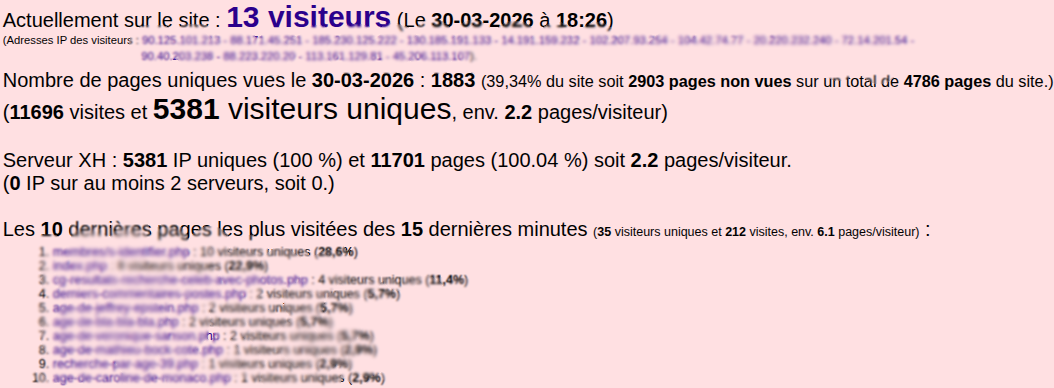 | Commentaire Sur Age Des Célébrités | Oui, Henry7, vous avez raison c'est bizarre... Je vais vérifier s'il n'y a pas un bug de l'IA qui s'occupe désormais de la modération car le nombre de visiteurs est conforme à nos scores habituels en semaine avec déjà 5381 visiteurs uniques depuis 0h00 ce jour, on devrait terminer la journée autour de 8 à 10 milles IP uniques...